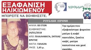 Άφαντη παραμένει δέκα ημέρες τώρα η 82χρονη Ειρήνη Ρουσσάκη, που χάθηκε στις 23 Ιανουαρίου από τα Πηλαλήματα Σητείας.