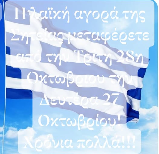 Η λαϊκή αγορά της Σητείας μεταφέρεται από την Τρίτη 28 Οκτωβρίου την παραμονή της Εθνικής Επετείου Δευτέρα 27 Οκτωβρίου!!!!