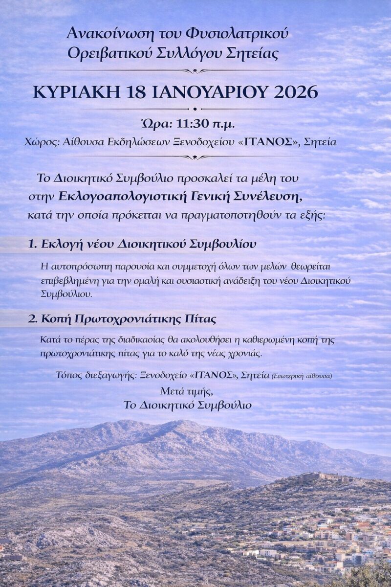 Σύμφωνα με τη σχετική ανακοίνωση του Φυσιολατρικού Ορειβατικού Συλλόγου Σητείας την Κυριακή 18 Ιανουαρίου και ώρα 11:30 στην αίθουσα εκδηλώσεων Ξενοδοχείου “ΤΑΝΟΣ” θα πραγματοποιηθεί η εκλογοαπολογιστική γενική συνέλευση κατά την οποία πρόκειται να πραγματοποιηθούν τα εξής:
